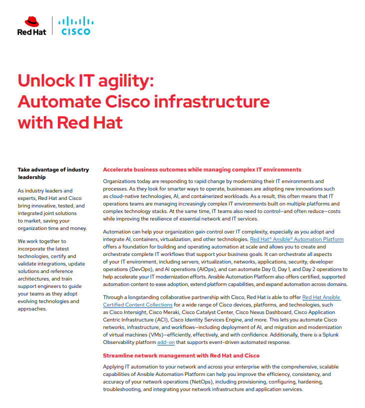 Explore how Red Hat Ansible Automation Platform and Cisco can help you streamline network management, scale AI adoption, and speed up VM migration.